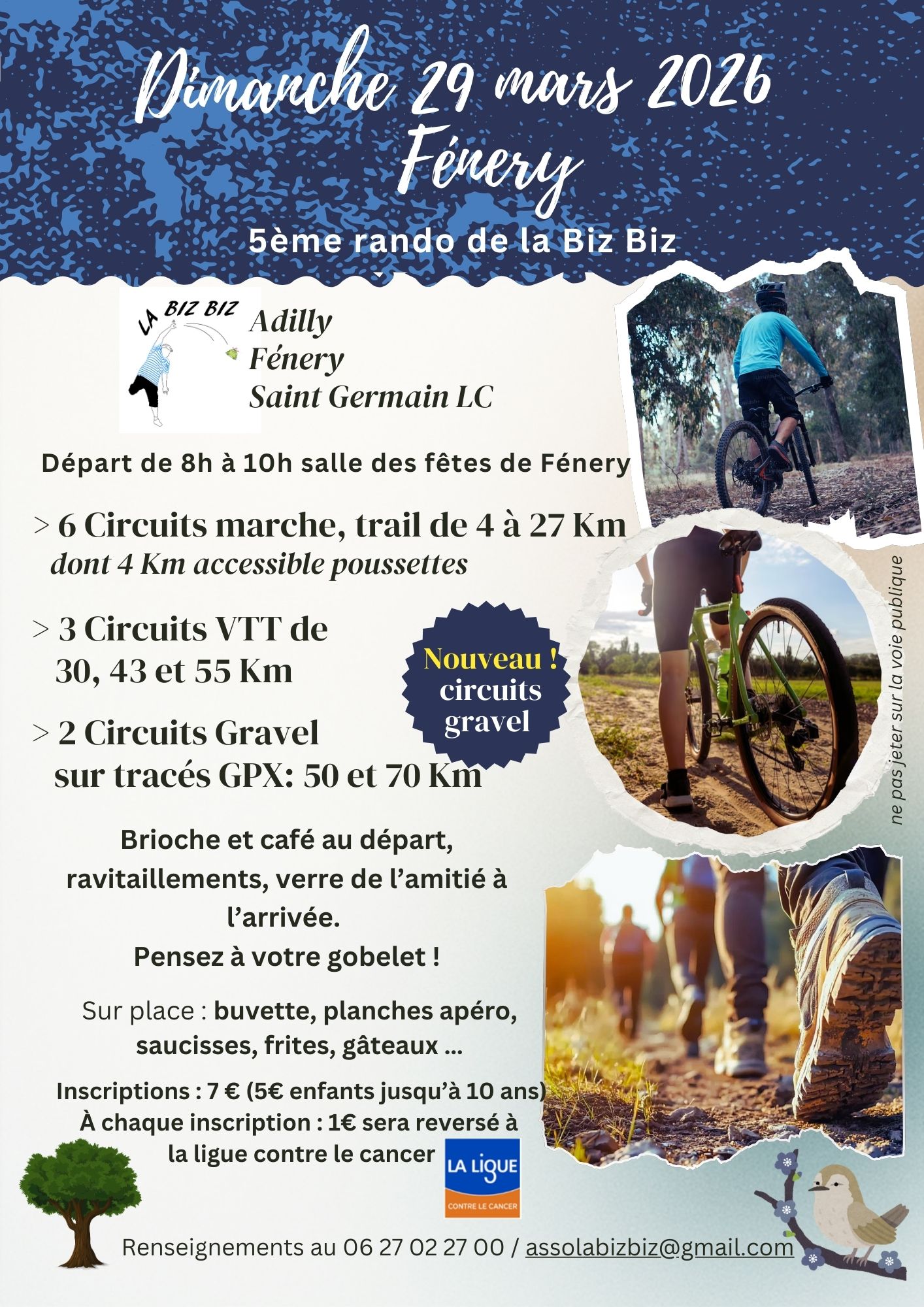 Randonnées pédestres et VTT au départ de la salle des fêtes de Fénery (79450), organisées par La Biz Biz.